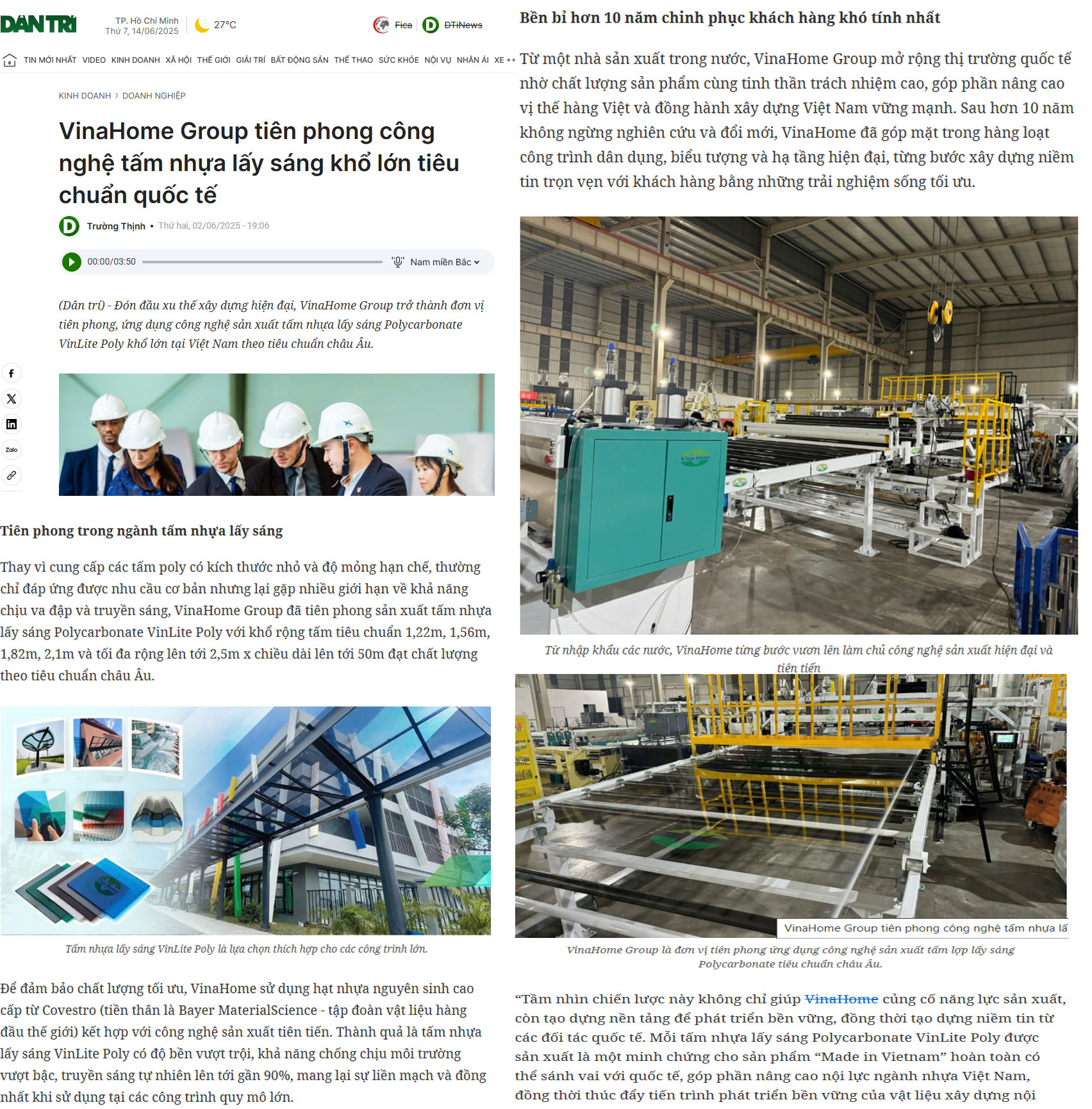 VinaHome Group – một doanh nghiệp nội địa – được báo Dân trí vinh danh vì những đột phá trong công nghệ. Cụ thể, VinaHome đã tiên phong sản xuất tấm nhựa lấy sáng Polycarbonate khổ lớn với tiêu chuẩn quốc tế, mở ra những tiềm năng to lớn cho các công trình từ dân dụng đến công nghiệp.