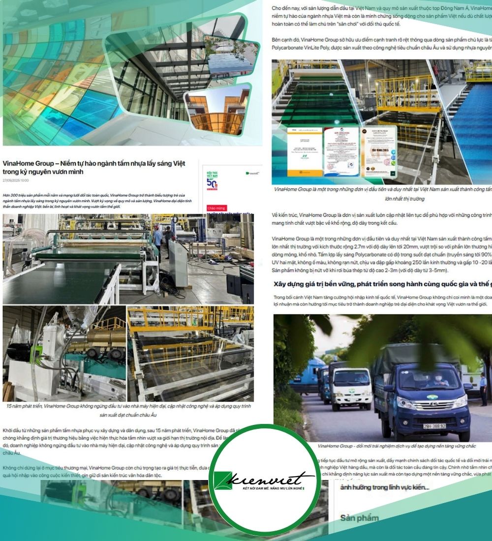 Trong bài viết đặc biệt trên Kienviet.net, VinaHome Group đã được vinh danh là "Niềm tự hào ngành tấm nhựa lấy sáng Việt trong kỷ nguyên vươn mình" – một khẳng định đầy tự hào về vị thế tiên phong của doanh nghiệp Việt trên thị trường vật liệu xây dựng. Bài báo nhấn mạnh hành trình 15 năm bền bỉ của VinaHome, từ một doanh nghiệp khởi nghiệp “trẻ, khỏe, năng động” trở thành thương hiệu “kỳ cựu”, dẫn đầu với sản lượng 300 triệu sản phẩm/năm, cùng mạng lưới đối tác trải dài khắp cả nước và vươn tầm quốc tế.