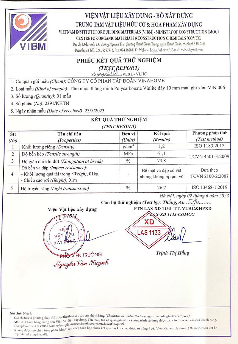 Phiếu kết quả thử nghiệm tấm nhựa Polycarbonate Vinlite