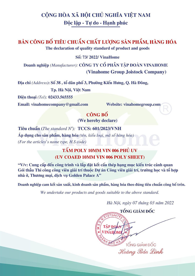 Bảng công bố chất lượng sản phẩm tấm nhựa lấy sáng VinaHome