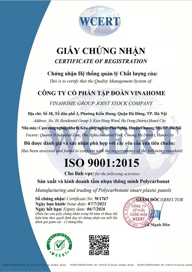 Giấy chứng nhận chất lượng sản phẩm tấm nhựa lấy sáng VinaHome