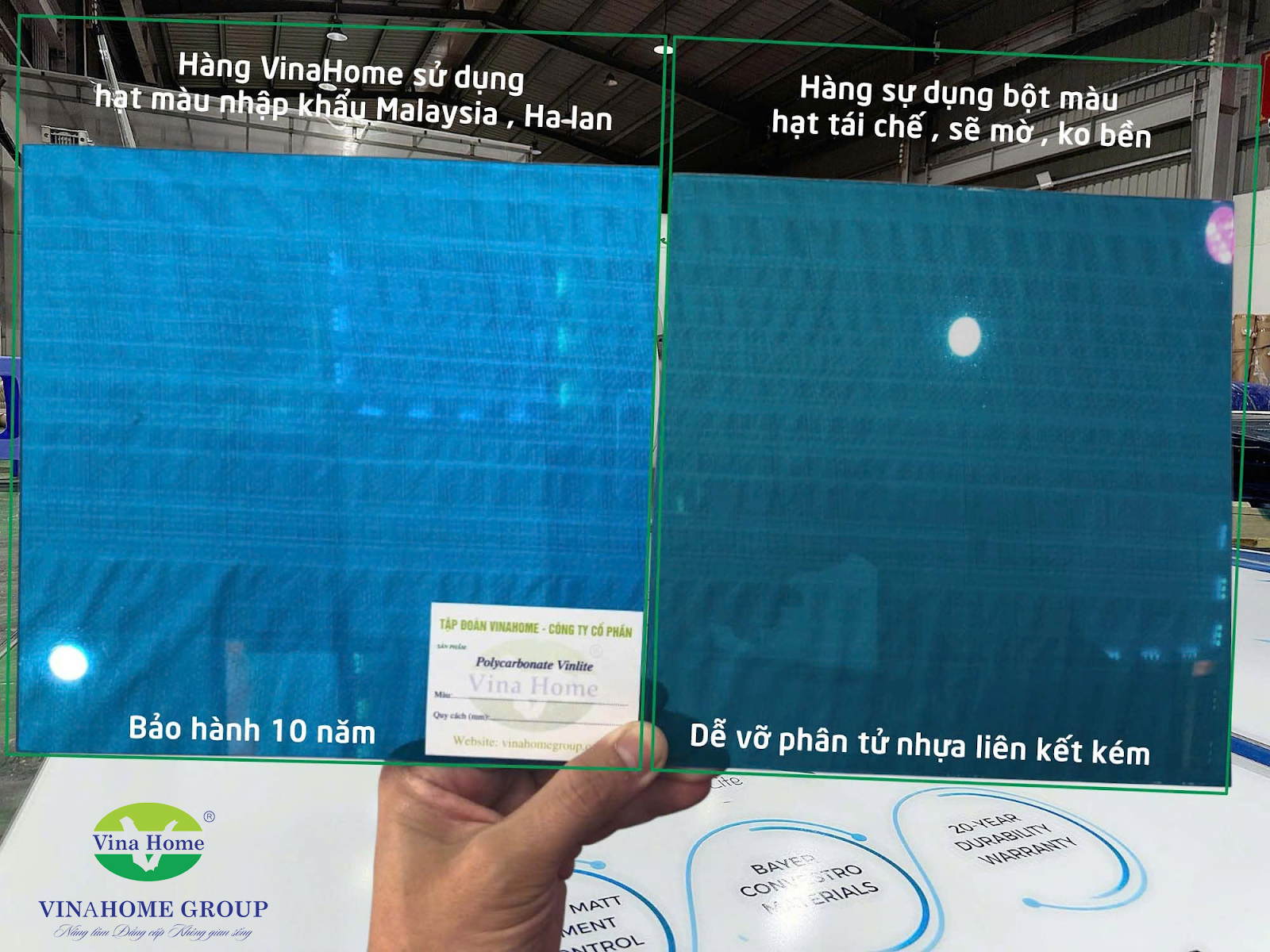 Dựa vào hình ảnh thực tế, có thể thấy sự khác biệt giữa tấm poly Vinahome và tấm ngoài thị trường có thể dễ dàng nhận ra bằng mắt thường, cụ thể như sau: