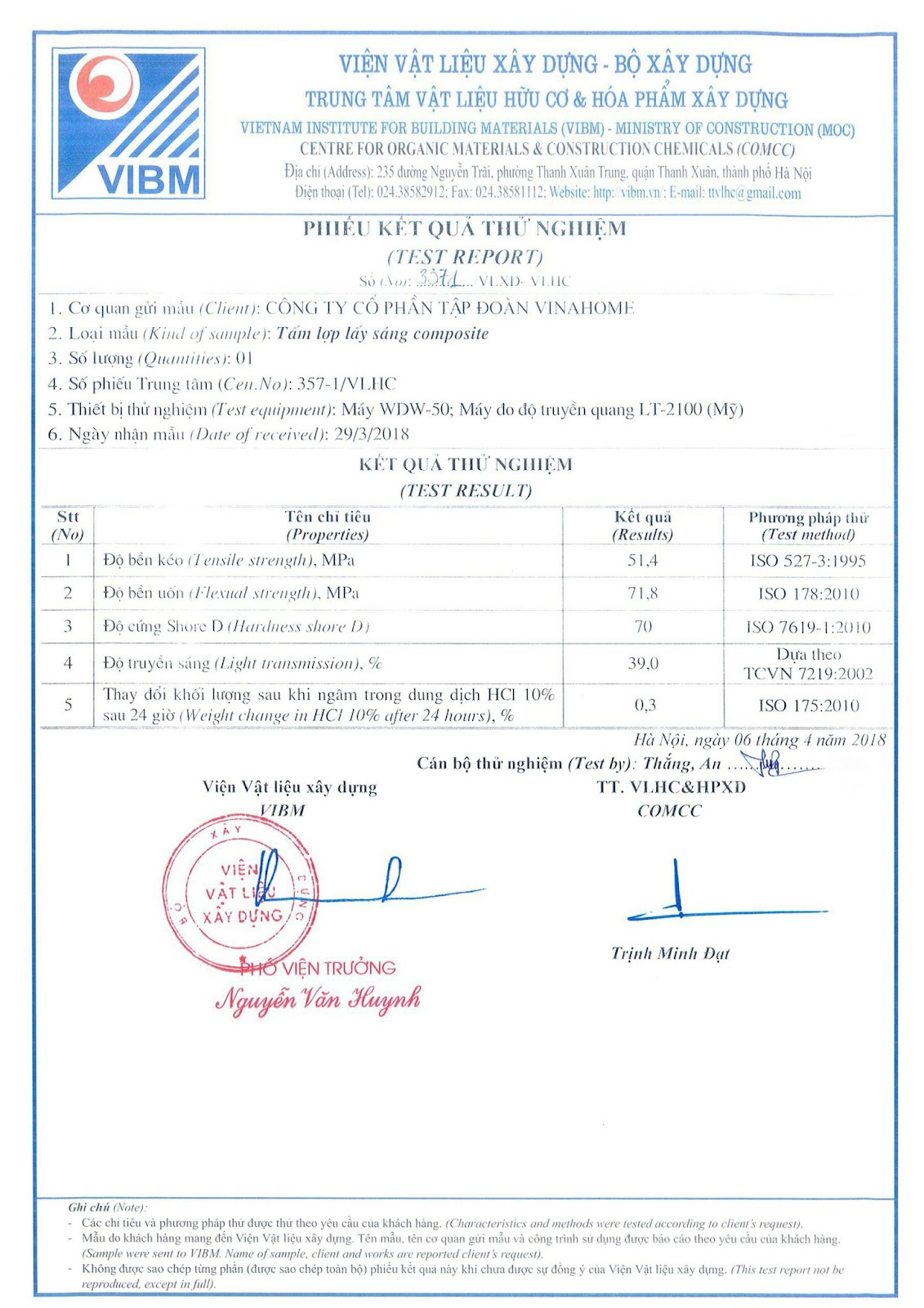 Vinahome cung cấp sản phẩm chính hãng, có các loại giấy chứng nhận về chất lượng sản phẩm. Các bảng nghiên cứu, phân tích về độ chịu lực, chịu va đập, khả năng uốn cong, độ bền dẻo, tính chống axit, cách âm, cách nhiệt và không dẫn điện của sản phẩm. Sản phẩm tấm lợp để lấy sáng composite được cung cấp bởi Vinahome đáp ứng được các tiêu chuẩn khắt khe về chất lượng cũng như thế kế thẩm mỹ của vật liệu.