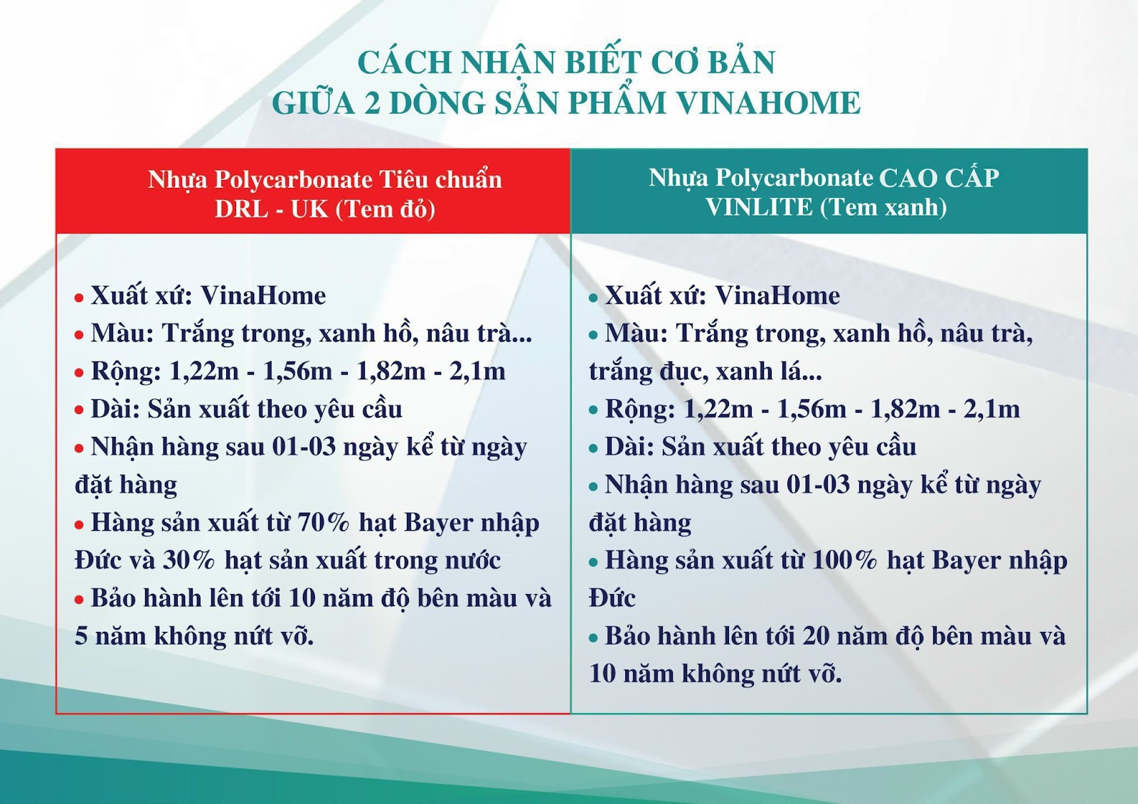 - Đặc tính sản phẩm : Độ trong suốt 90% , không chịu tác động của thời tiết, chất lượng cao theo các tiêu chuẩn của châu Âu, giá thành cạnh tranh.