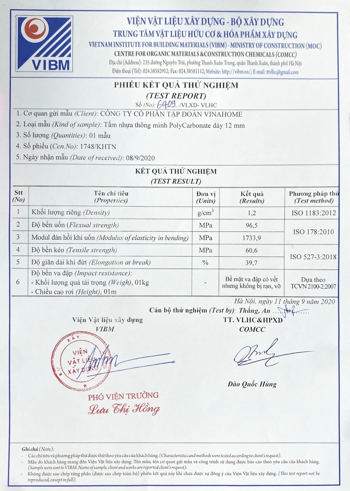 XII. Các quy cách kỹ thuật của tấm lợp thông minh rỗng ruột Vinahome