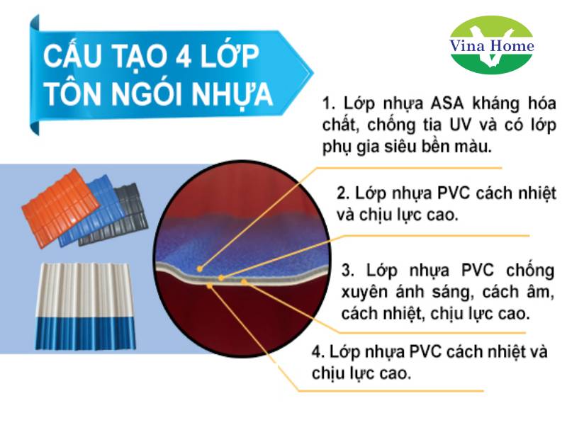 Vật liệu tấm mái PVC phủ ASA thường được sản xuất và có cấu tạo 4 lớp như sau: